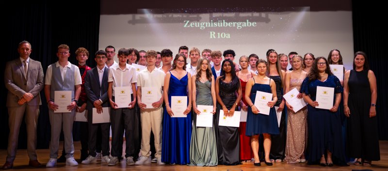 Eröffnet wurde der Abend durch den feierlichen Einzug der Klassen. Danach begrüßte Schulleiter Erik Rau das Publikum mit einer humorvollen Rede in Form eines „inneren Monologs“. Dabei versetzte er sich sowohl in die Gedankenwelt der Schülerinnen und Schüler als auch der Lehrkräfte – und das ausgerechnet am Tag der schriftlichen Prüfung. Augenzwinkernd ließ er die Prüfungszeit zwischen Nervosität, Hoffnung und Lehrerkommentaren Revue passieren – das Publikum war begeistert. Ein großes Lob richtete Herr Rau an die drei Klassenlehrerinnen Frau Siegmann-Birn (R10a), Frau Wild (R10b) und Frau Wagner (R10c) für die erfolgreiche Führung der Klassen und die konstruktive Unterstützung der Schülerinnen und Schüler auf ihrem Weg zum Abschluss. Ein Lob, das später auch durch die Schüler- und Elternbeiträge bestätigt wurde.
