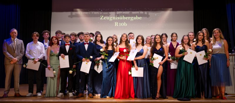 Nach der Pause verzauberte die R10C mit dem Lied „Bella Napoli“ und zeigte ein liebevoll gestaltetes Video mit Bildern aus der gemeinsamen Schulzeit. In seiner Rede würdigte der Vorsitzende des Elternbeirats, Herr Ritter, die Leistungen der Schülerinnen und Schüler sowie das Engagement der Lehrkräfte. Als Zeichen der Anerkennung überreichte der Elternbeirat allen Fachlehrkräften kleine Präsente. Außerdem erhielt jede Absolventin und jeder Absolvent eine weiße Rose – organisiert vom Elternbeirat und im Rahmen der Zeugnisübergabe feierlich durch die jeweilige Klassenlehrkraft überreicht.