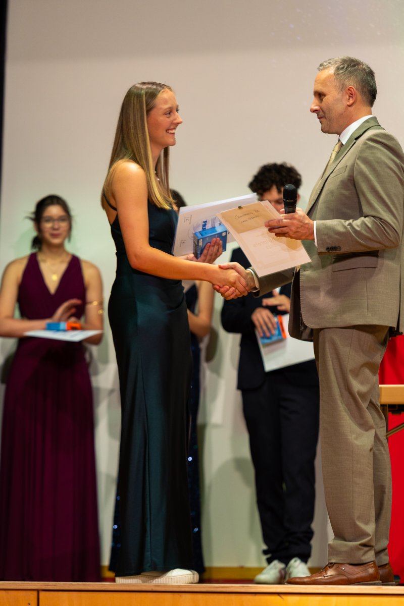 Ein weiterer Höhepunkt des Abends war die Verleihung der Preise und Sonderpreise. Es konnte sich Nele Straupe (R10C) freuen, die als Schulbeste mit einem Notenschnitt von 1,2 ein sagenhaftes Ergebnis erzielte. Ein Sozialwissenschaftlicher Preis ging an Lina Hartmann und Marie Trabold (beide R10B), den Paul-Schempp-Preis von Religion erhielt Sophia Monaci (R10B). Der Otto-Neumeister-Preis ging an Maya Wesner (R10B) und Nele Straupe (R10C).