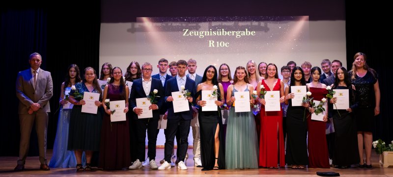 Nach der Pause verzauberte die R10C mit dem Lied „Bella Napoli“ und zeigte ein liebevoll gestaltetes Video mit Bildern aus der gemeinsamen Schulzeit. In seiner Rede würdigte der Vorsitzende des Elternbeirats, Herr Ritter, die Leistungen der Schülerinnen und Schüler sowie das Engagement der Lehrkräfte. Als Zeichen der Anerkennung überreichte der Elternbeirat allen Fachlehrkräften kleine Präsente. Außerdem erhielt jede Absolventin und jeder Absolvent eine weiße Rose – organisiert vom Elternbeirat und im Rahmen der Zeugnisübergabe feierlich durch die jeweilige Klassenlehrkraft überreicht.