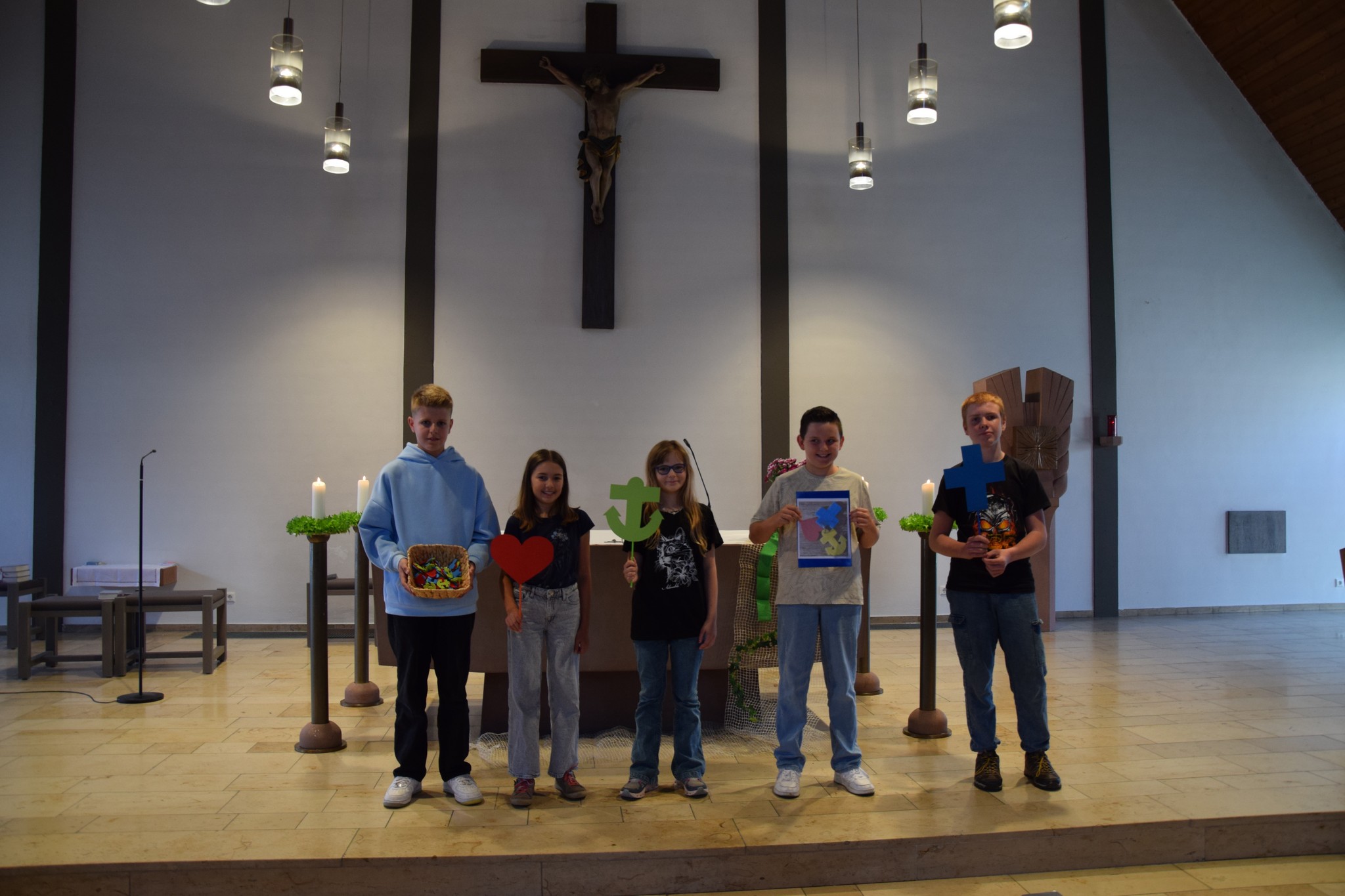 Der besondere Tag begann mit einem ökumenischen Gottesdienst in der katholischen Kirche in Neuenstadt. Unter der Leitung von Gemeindereferentin Claudia Wahl sowie den Lehrkräften Maria Vogt und Manuela Leuser gestalteten auch freiwillige Sechstklässler die Feier. Passend zum Motto „Glaube, Liebe, Hoffnung“ erhielten alle neuen Fünftklässlerinnen und Fünftklässler einen kleinen Schlüsselanhänger mit Kreuz, Herz und Anker – ein Symbol für Vertrauen, Zusammenhalt und Zuversicht auf ihrem neuen Weg.