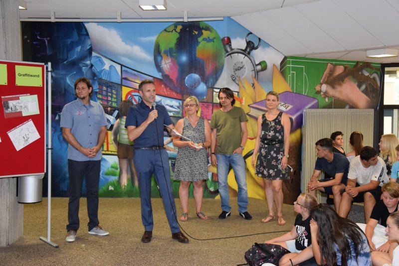 Die Feierlichkeit wurde um 14 Uhr durch den Schulleiter Herrn Rau eröffnet. Einen Schwerpunkt dieses zentralen Veranstaltungsteils in der Aula bildete die Vorstellung des Künstlers Don, welcher die Wände des Schulhauses in den letzten Monaten mit Kunstwerken verziert hatte. Bunte Bilder schmücken nun mehrere Wandflächen des Gebäudes. Bei einer Wandgestaltung handelte es sich um eine Auftragsarbeit anlässlich des 50-jährigen Schuljubiläums. In diesem kollagenartigen Gemälde greift Don verschiedene zeit- und schulbezogene Themen auf. Im Rahmen seiner Vorstellung lieferte er der Schulgemeinde eine Interpretation seines Kunstwerks, das mit der Unterstützung des Schulverbandes durch die Volksbank Möckmühl realisiert werden konnte. Daraus entstanden war ein Schülerworkshop, in dem Don Schülerinnen im künstlerischen Umgang mit der Spraydose anleitete. Herr Rau würdigte das Engagement der Schülerinnen Lea Englert, Natalie Kaiser, Juliana Kerschbaum, Maren Bürk und Laura Alemanno in Form einer Urkunde.